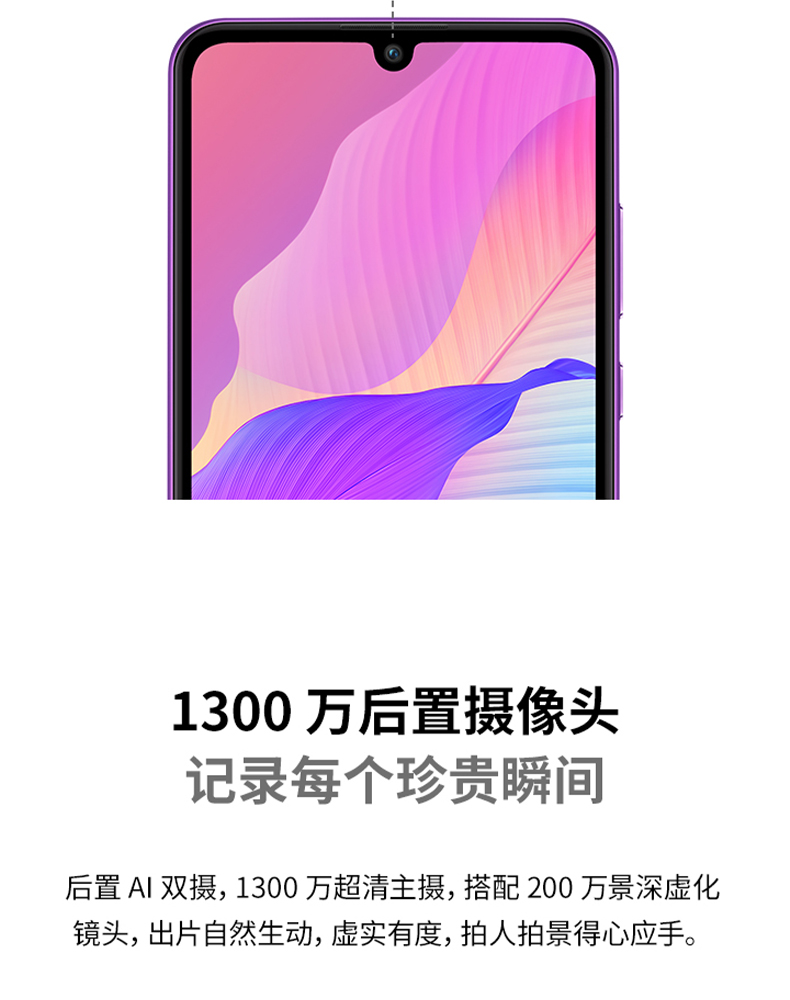 規(guī)格參數(shù) 拍照功能 后置攝像頭 1300萬(wàn)像素?cái)z像頭+200萬(wàn)像素?cái)z像頭 攝像頭類(lèi)型 三攝像頭(后雙) 顯示 分辨率 HD+1600x720像素 屏幕尺寸 6.3英寸 網(wǎng)絡(luò) 網(wǎng)絡(luò)類(lèi)型 4G全網(wǎng)通 網(wǎng)絡(luò)模式 雙卡雙待 機(jī)身詳情 款式 直板 存儲(chǔ) 存儲(chǔ)容量 4+64GB 4+128GB 6+128GB 基本參數(shù) 品牌 Huawei/華為 華為型號(hào) 暢享 20e 機(jī)身顏色 綺境森林 幻影紫 幻夜黑 手機(jī)類(lèi)型 智能手機(jī) CPU品牌 聯(lián)發(fā)科