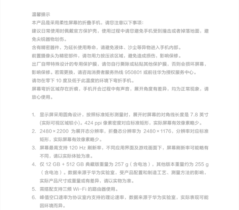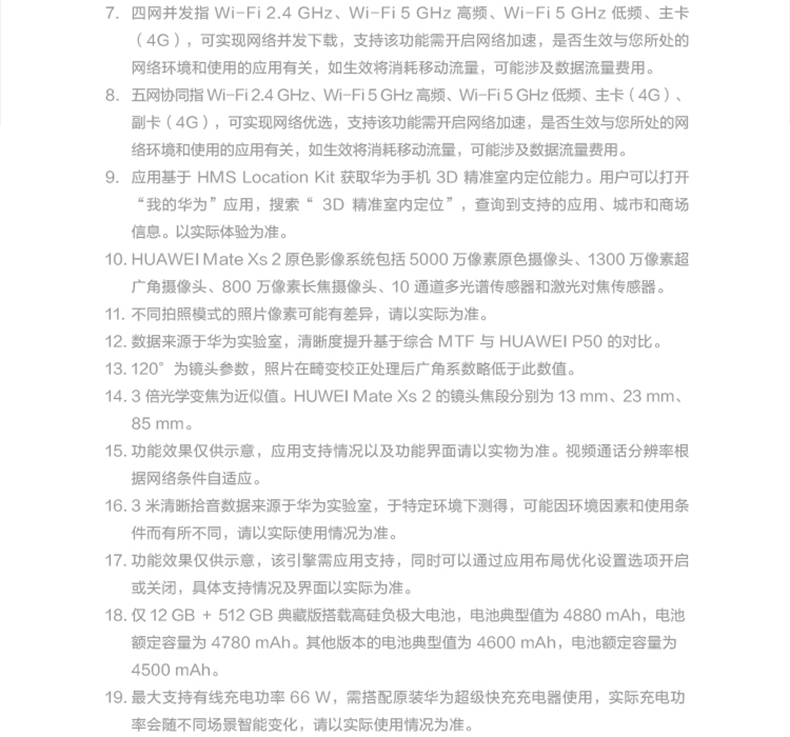 規(guī)格參數(shù) 拍照功能 后置攝像頭 5000萬像素原色攝像頭+ 1300萬像素超廣角攝像頭+ 800萬像素長焦攝像頭 攝像頭類型 四攝像頭(前一后三) 顯示 分辨率 展開態(tài):2480*2200 折疊態(tài):2480*1176 備注:該分辨率對應(yīng)標(biāo)準(zhǔn)矩形,實(shí)際屏幕有效像素略少。 屏幕尺寸 7.8英寸 網(wǎng)絡(luò) 網(wǎng)絡(luò)類型 4G全網(wǎng)通 網(wǎng)絡(luò)模式 雙卡雙待 存儲(chǔ) 存儲(chǔ)容量 8GB+256GB 8GB+512GB 12GB+512GB 典藏版 基本參數(shù) 品牌 Huawei/華為 華為型號 HUAWEI Mate XS 2 CPU核心數(shù) 八核 機(jī)身顏色 雅黑 錦白 霜紫 手機(jī)類型 智能手機(jī) 操作系統(tǒng) HarmonyOS CPU品牌 高通