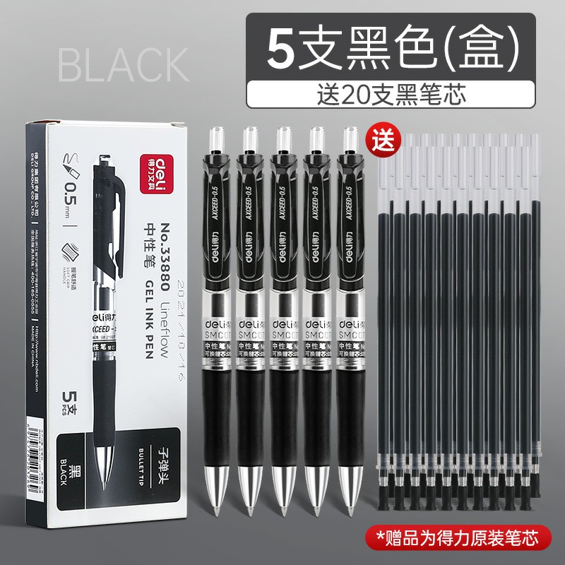 5支黑色盒裝-得力按動(dòng)筆中性筆水筆學(xué)生用考試按壓式子彈頭碳素黑色水性簽字筆芯05mm圓珠筆藍(lán)黑紅筆教師辦公文具用品