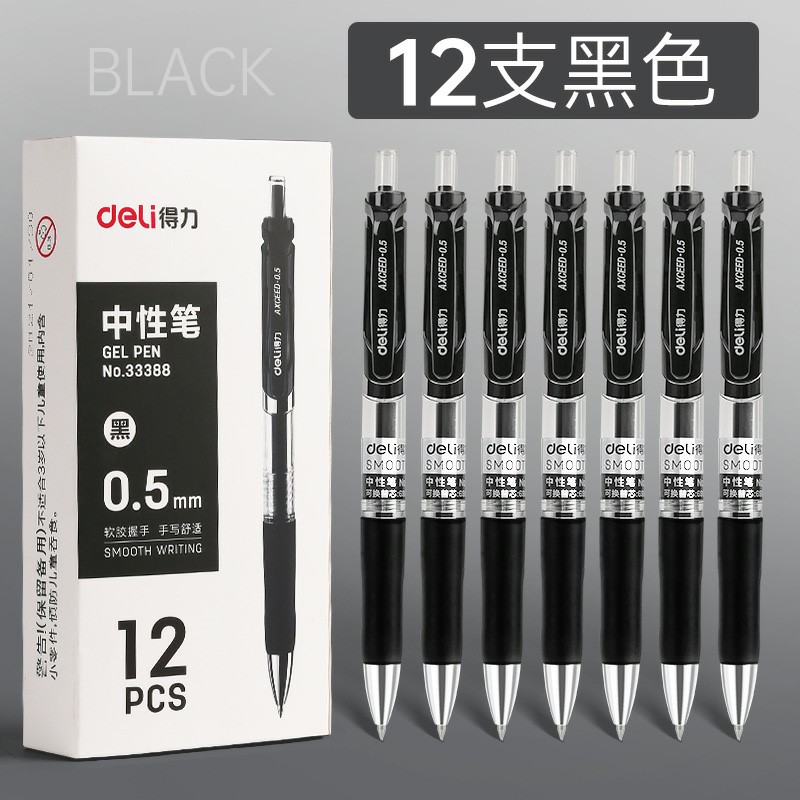 12支黑色-得力按動(dòng)筆中性筆水筆學(xué)生用考試按壓式子彈頭碳素黑色水性簽字筆芯05mm圓珠筆藍(lán)黑紅筆教師辦公文具用品