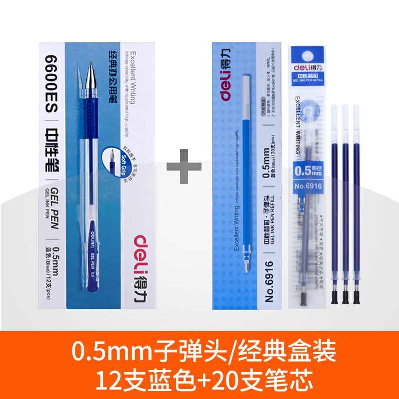 12支藍色+20支筆芯-得力文具中性筆學生用黑色0.5mm子彈頭水筆藍紅簽字筆批改筆記賬筆辦公用品書寫工具碳素筆50/12支裝