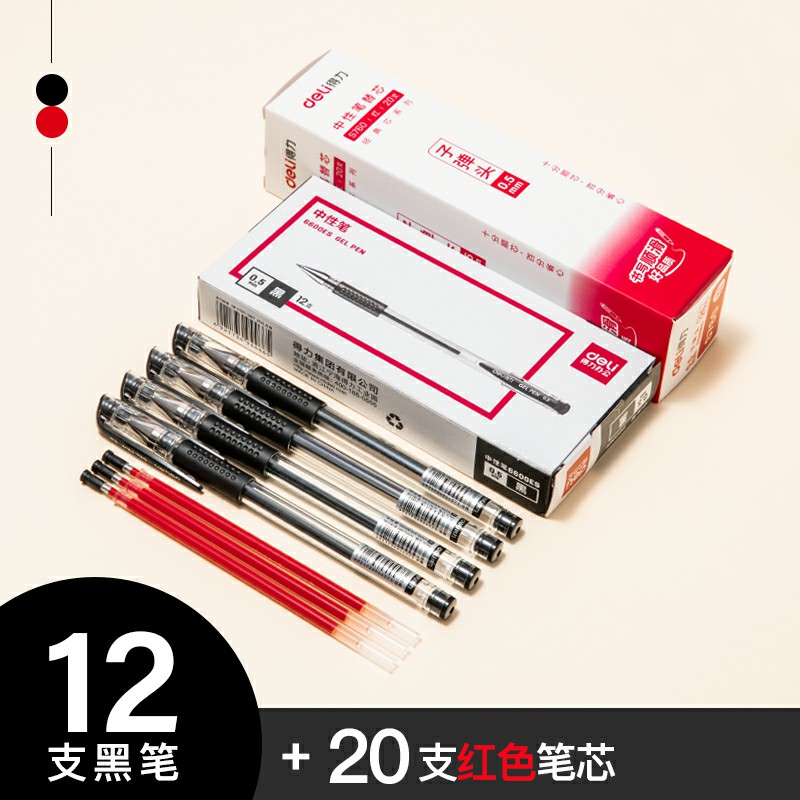 12支黑色+20支紅色筆芯 得力中性筆0.5黑色水筆簽字筆碳素筆12支學(xué)生用文具用品藍(lán)黑筆辦公簽名筆水性筆紅筆考試黑筆圓珠筆辦公用品