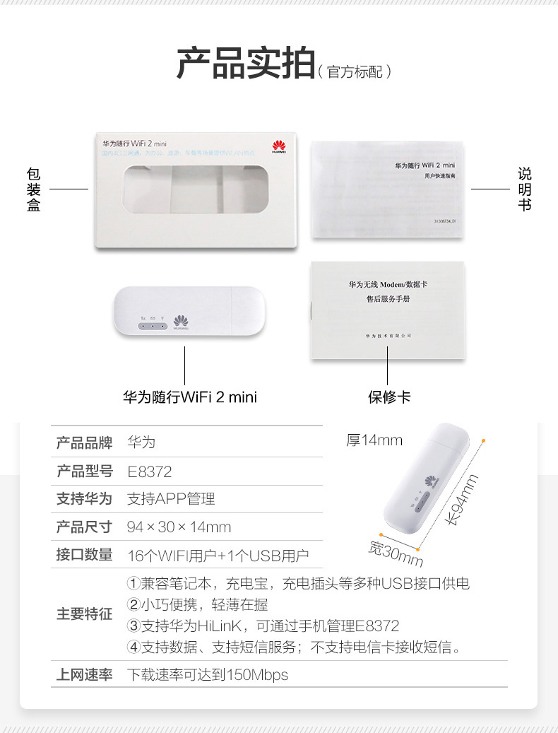 3C規(guī)格型號:E8372h-820(通過USB接口供電)