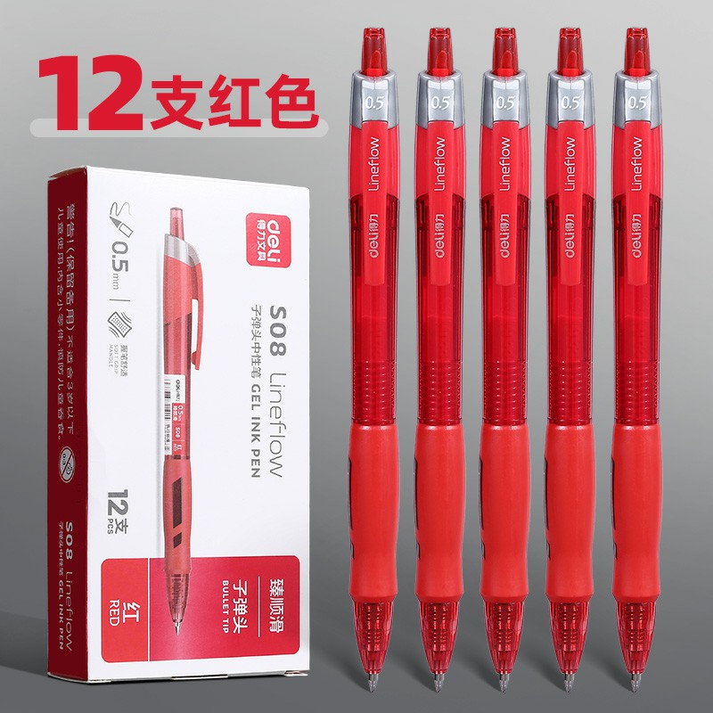 12支紅色-得力按動筆中性筆水筆學(xué)生用考試按壓式子彈頭碳素黑色水性簽字筆芯05mm圓珠筆藍(lán)黑紅筆教師辦公文具用品