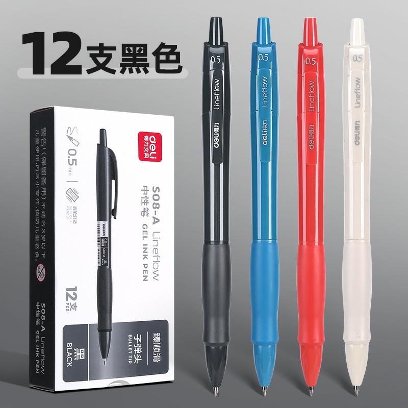 12支黑色-得力按動筆中性筆水筆學(xué)生用考試按壓式子彈頭碳素黑色水性簽字筆芯05mm圓珠筆藍(lán)黑紅筆教師辦公文具用品