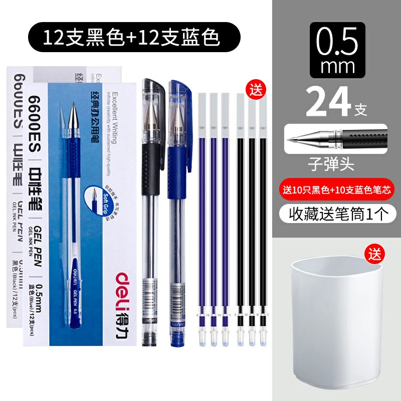 12支黑色+12藍(lán)色-得力文具中性筆學(xué)生用黑色0.5mm子彈頭水筆藍(lán)紅簽字筆批改筆記賬筆辦公用品書寫工具碳素筆50/12支裝